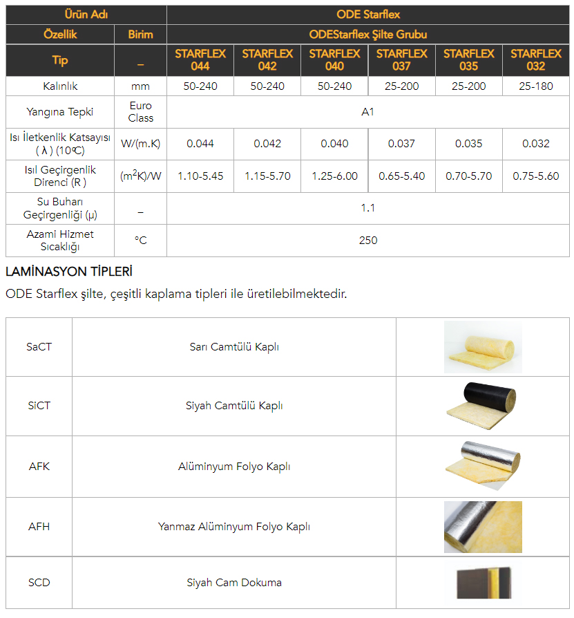 ODE Starflex Şilte Grubu λ = 0.032-0.044 W/(m.K) ısı iletkenlik katsayısı aralığında üretilmektedir.