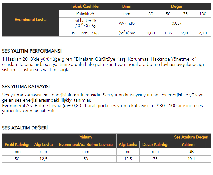 - (α)= 0,80 ses yutum katsayısı ile projelere ısı ve ses yalıtımında verimli çözümler sunar.